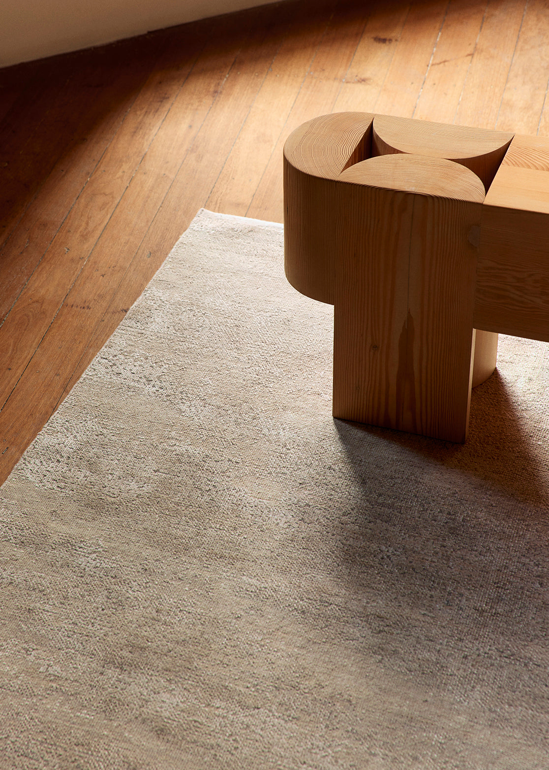 Embodying subtle luminosity, Alma features a lustrous texture and nuanced tonal gradations that ensure no two rugs are exactly the same. Hand-knotted with silk and wool, this ultra-low pile rug reflects a gentle patina, serving as a reminder that all things shift and transform over time.