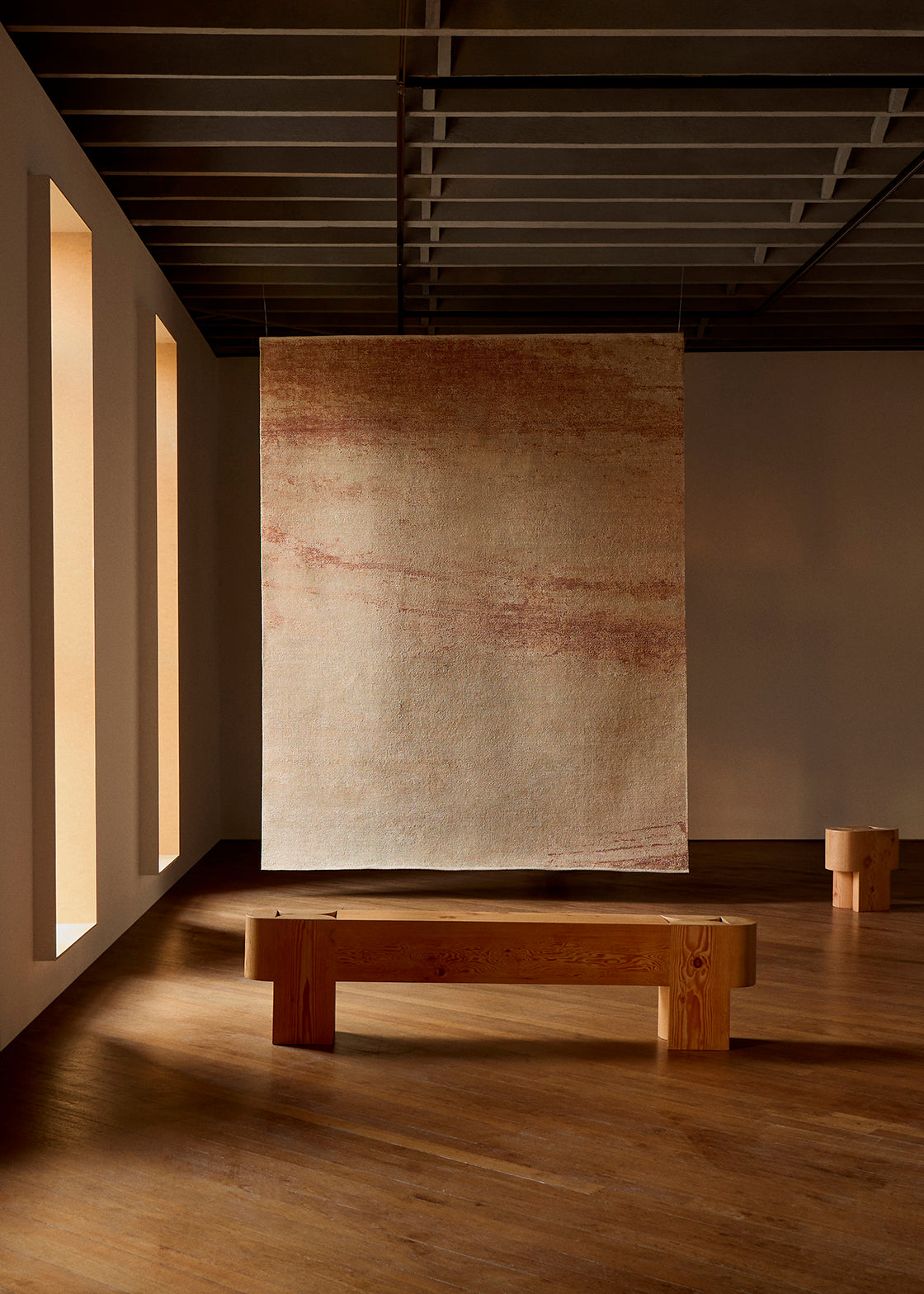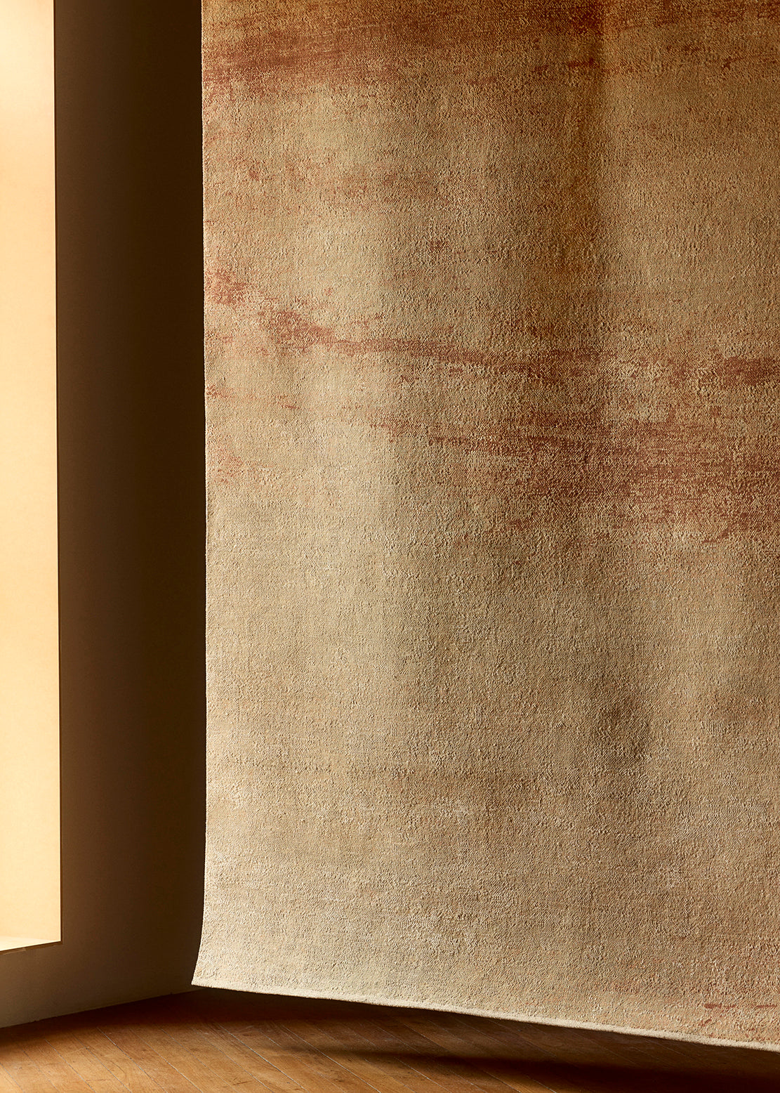 Embodying subtle luminosity, Alma features a lustrous texture and nuanced tonal gradations that ensure no two rugs are exactly the same. Hand-knotted with silk and wool, this ultra-low pile rug reflects a gentle patina, serving as a reminder that all things shift and transform over time.