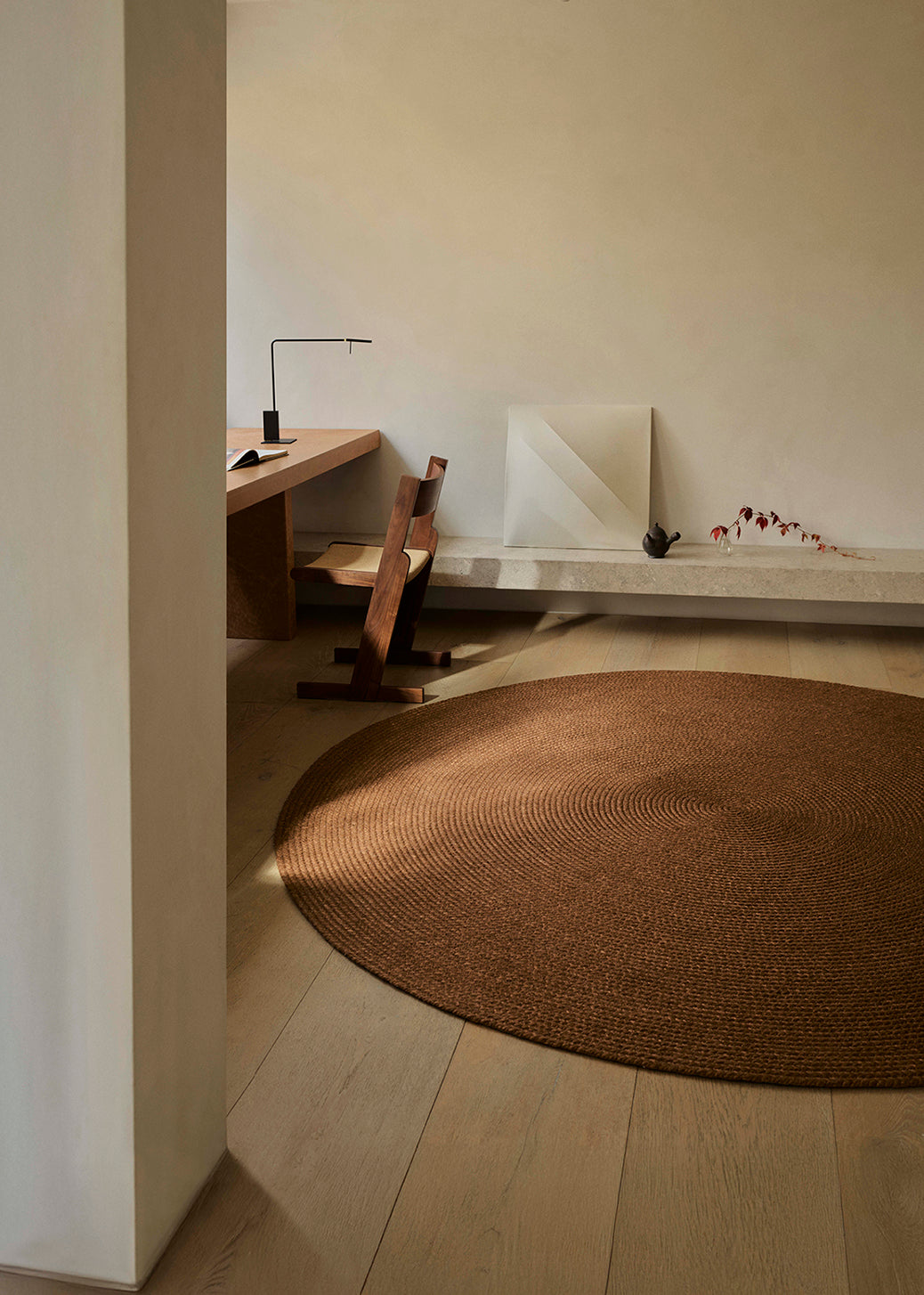 The Braid rug is hand-plaited from a luxurious wool-blend yarn that is carefully coiled then stitched into its circular form. Cloaked in vibrant yet elegant tones, the rug’s pairing of gentle curves and rippling texture brings harmony to the home, even when laid in the most unexpected of spaces.