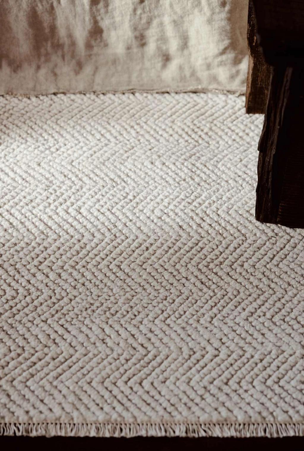 Crest traces the landscape of treelined horizons into a scenic herringbone pattern. Luscious wool is carded, spun and knotted by hand into compelling contrasts of high pile and low weave.