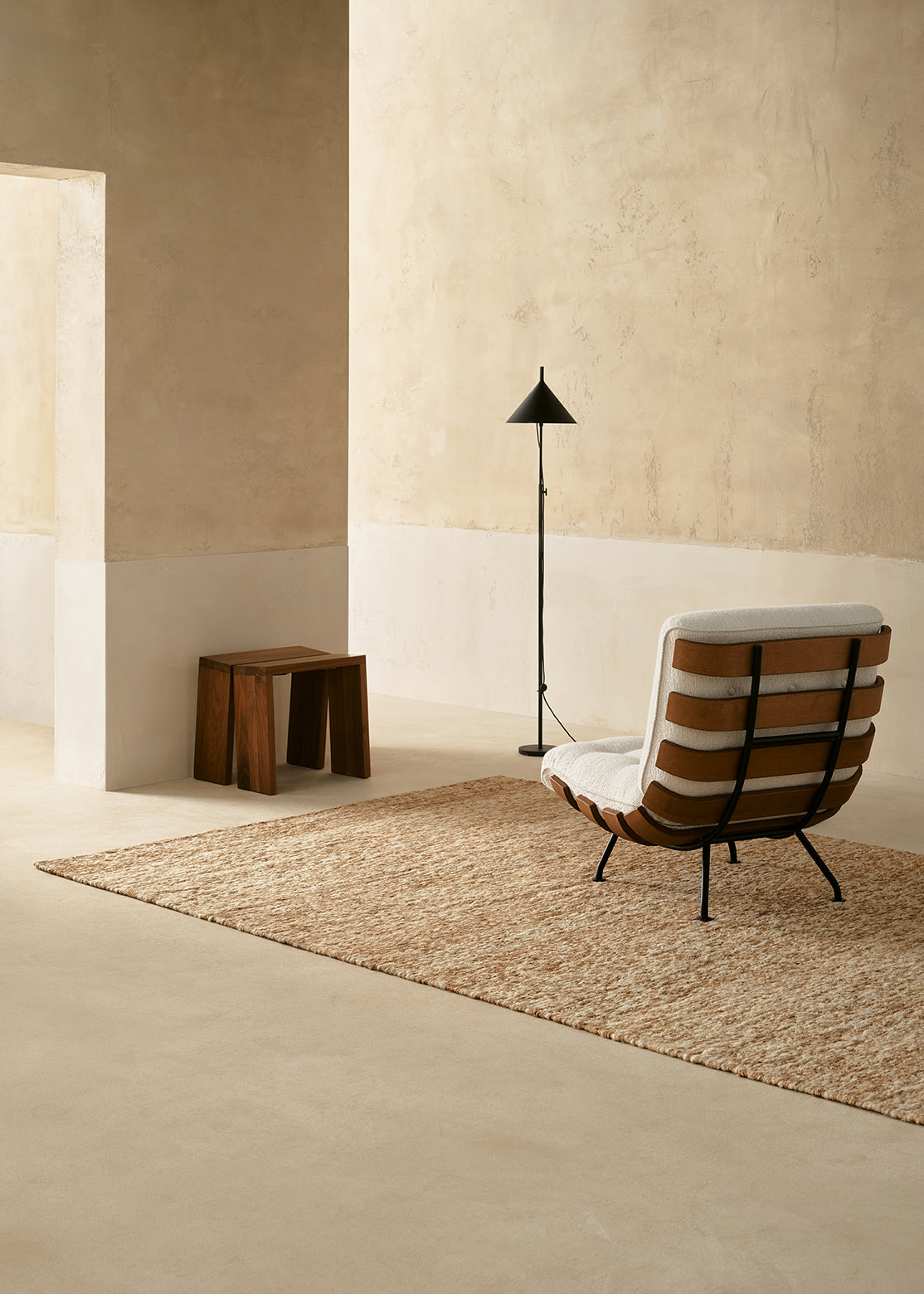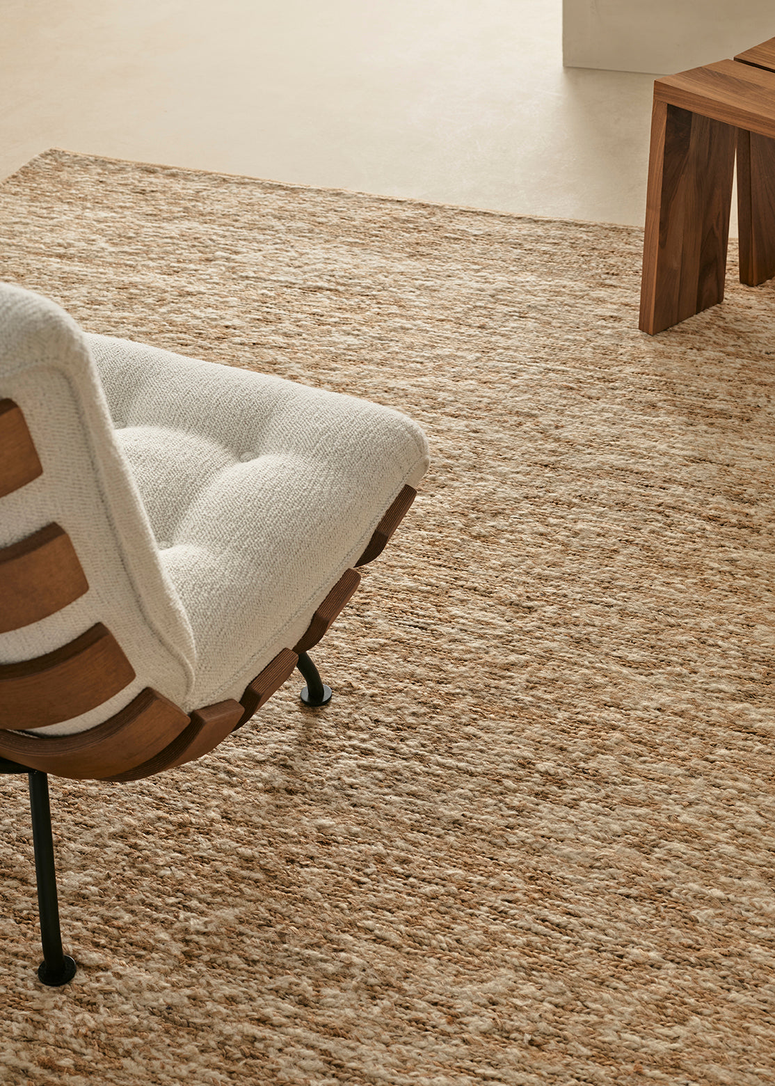 Panama is crafted by hand using a Soumak method, interweaving jute with virgin wool. The plaited fibre is left raw and full of tonal depth before being dyed to create subtle variations in colour and a unique, one-of-a-kind piece.