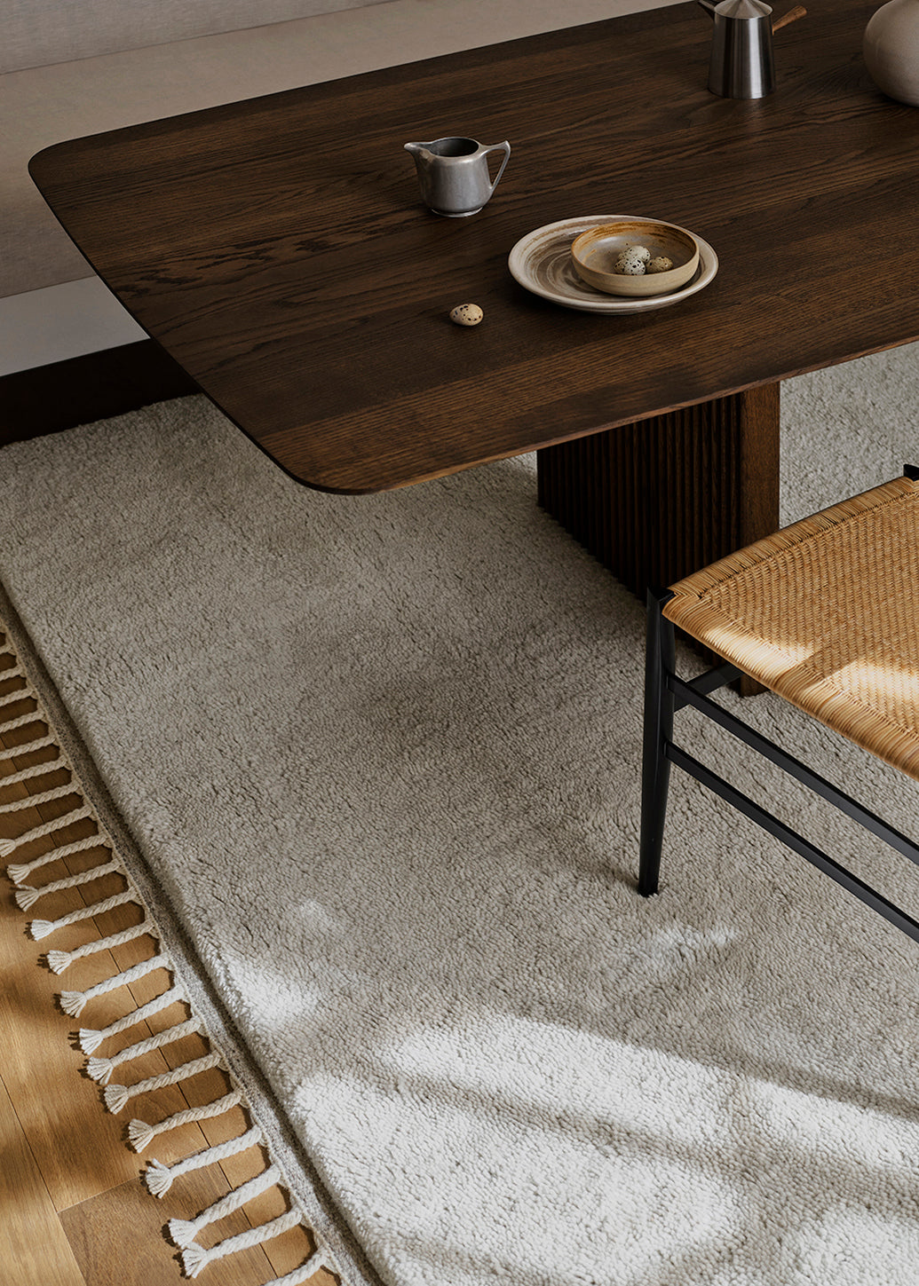 Framing the home for the practice of gentle rituals, this modern take on the traditional Berber-style rug oozes effortless luxury. Hand-knotted from New Zealand wool into a lush pile bookended by plaited tassels, the cloud-like surface has a meditative effect underfoot.