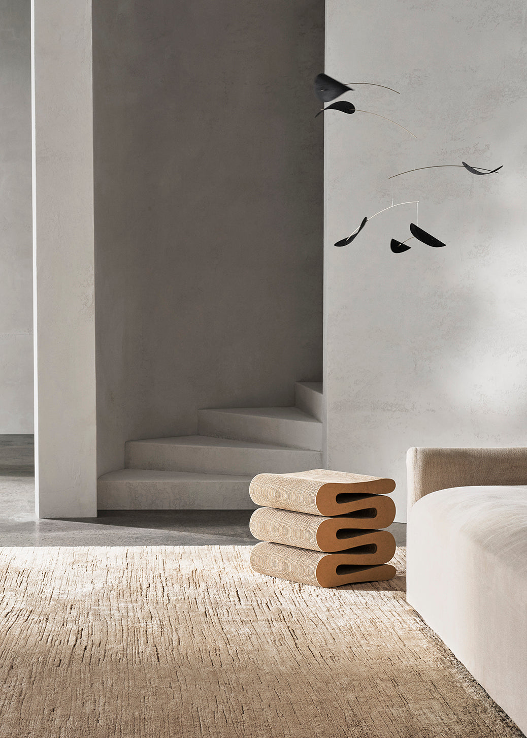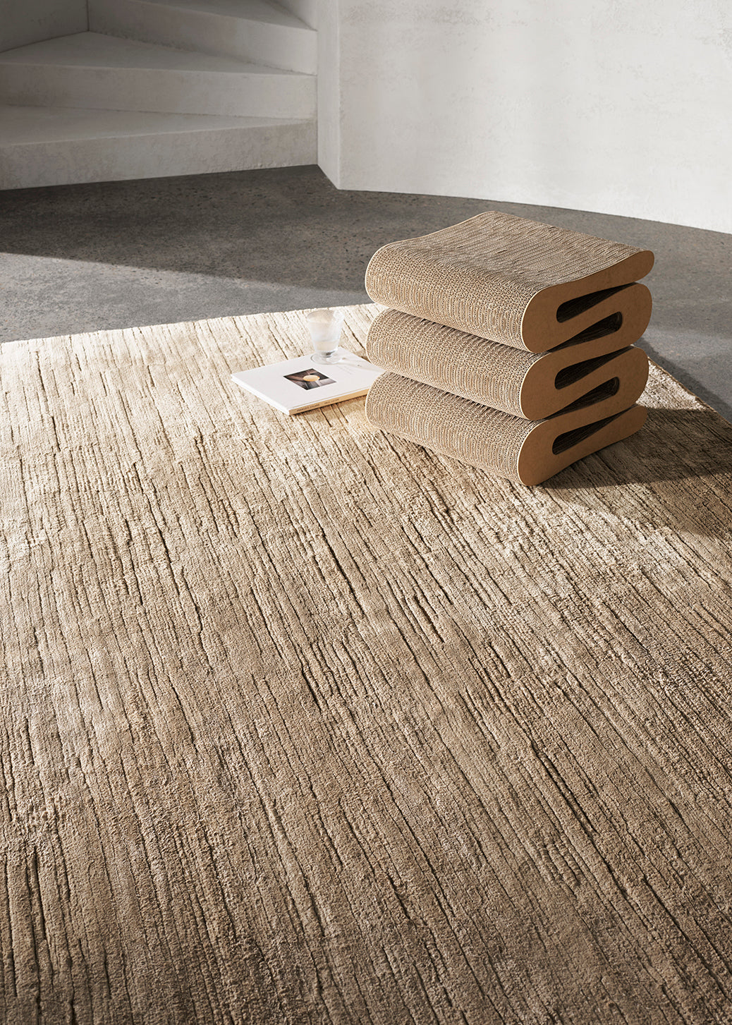 Staccato is a beguiling mix of instinct and precision, featuring an Indo-Nepali weave of lustrous silk alternated with linen loops that are hidden and exposed in a seemingly improvised staggered design. With its lyrical texture, quiet corners instantly become covetable spaces.